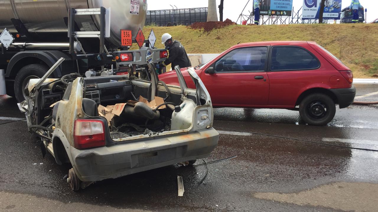 A Defesa Civil, o Corpo de Bombeiros, o Samu, e outros órgãos, foram mobilizados para uma ocorrência em Maringá, em um posto de combustíveis, na PR-317, saída para Astorga. Dois carros e uma moto bateram em uma carreta com líquido inflamável. Seria um acidente grave, não fosse o fato de que era uma simulação feita por um grupo de transportes.