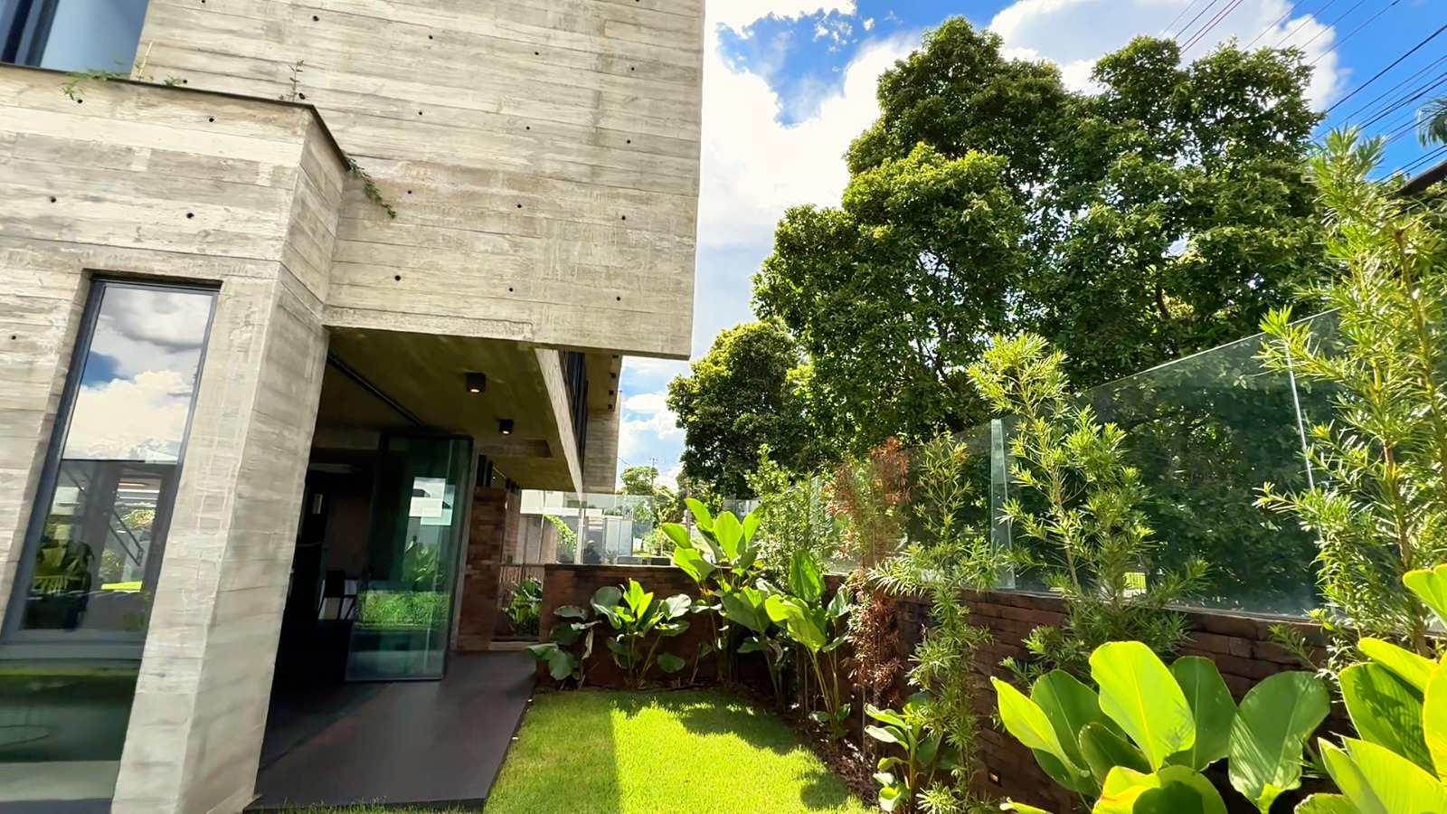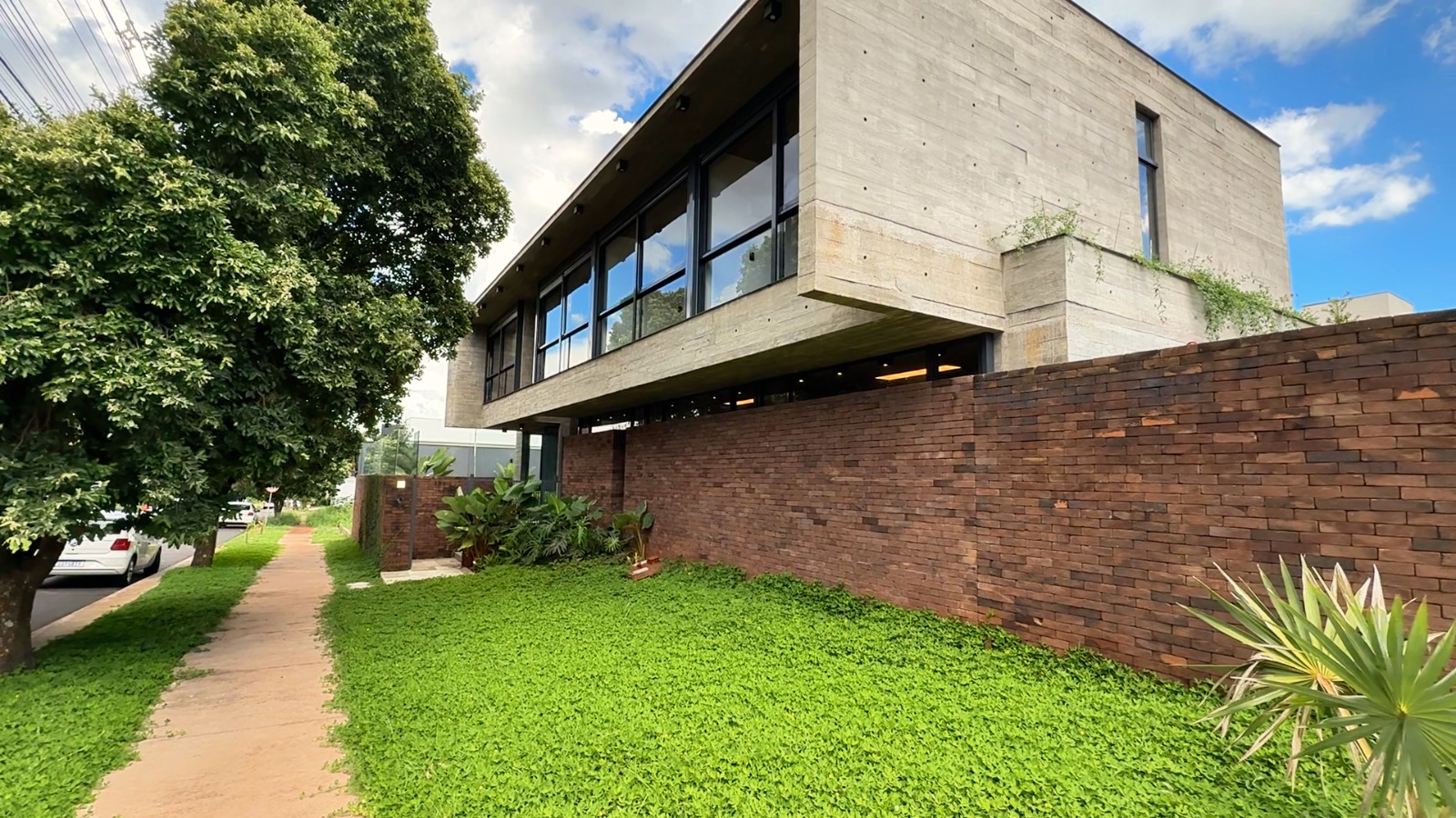 O chamado Sobrado Casa Concreto ocupa um terreno de 519 metros quadrados e possui 361 metros quadrados de área construída. Localizada em uma esquina estratégica, em frente ao condomínio Morada de Florença, a residência impressiona pela imponência já na fachada, marcada por linhas retas, volumes robustos e acabamento sofisticado.