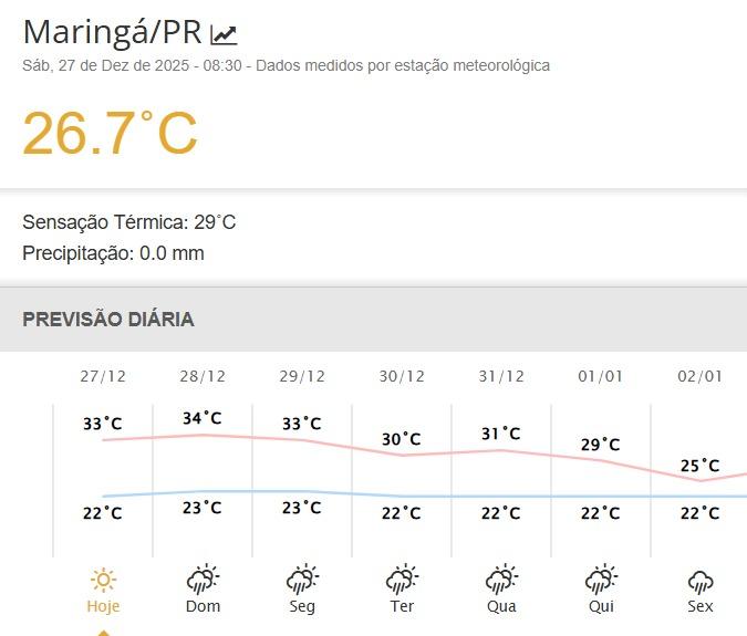 Cidade por Luciana Peña em 27/12/2025 - 09:00O sábado amanheceu com temperatura de 22ºC em Maringá e os termômetros devem chegar a 33ºC.