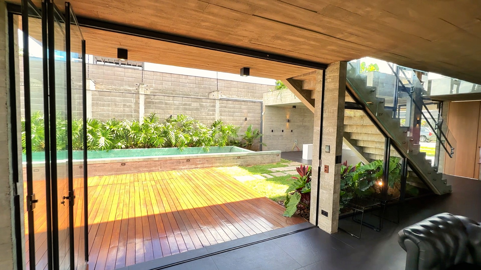 O chamado Sobrado Casa Concreto ocupa um terreno de 519 metros quadrados e possui 361 metros quadrados de área construída. Localizada em uma esquina estratégica, em frente ao condomínio Morada de Florença, a residência impressiona pela imponência já na fachada, marcada por linhas retas, volumes robustos e acabamento sofisticado.