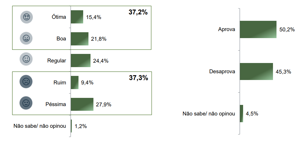Além disso 37,2% consideram a administração ótima (15,4%) ou boa (21,8%). Para 24,4% ela é regular. Já para 37,3%, a administração é ruim (9,4%) ou péssima (27,9%). Apenas 1,2% não souberam ou não opinaram.