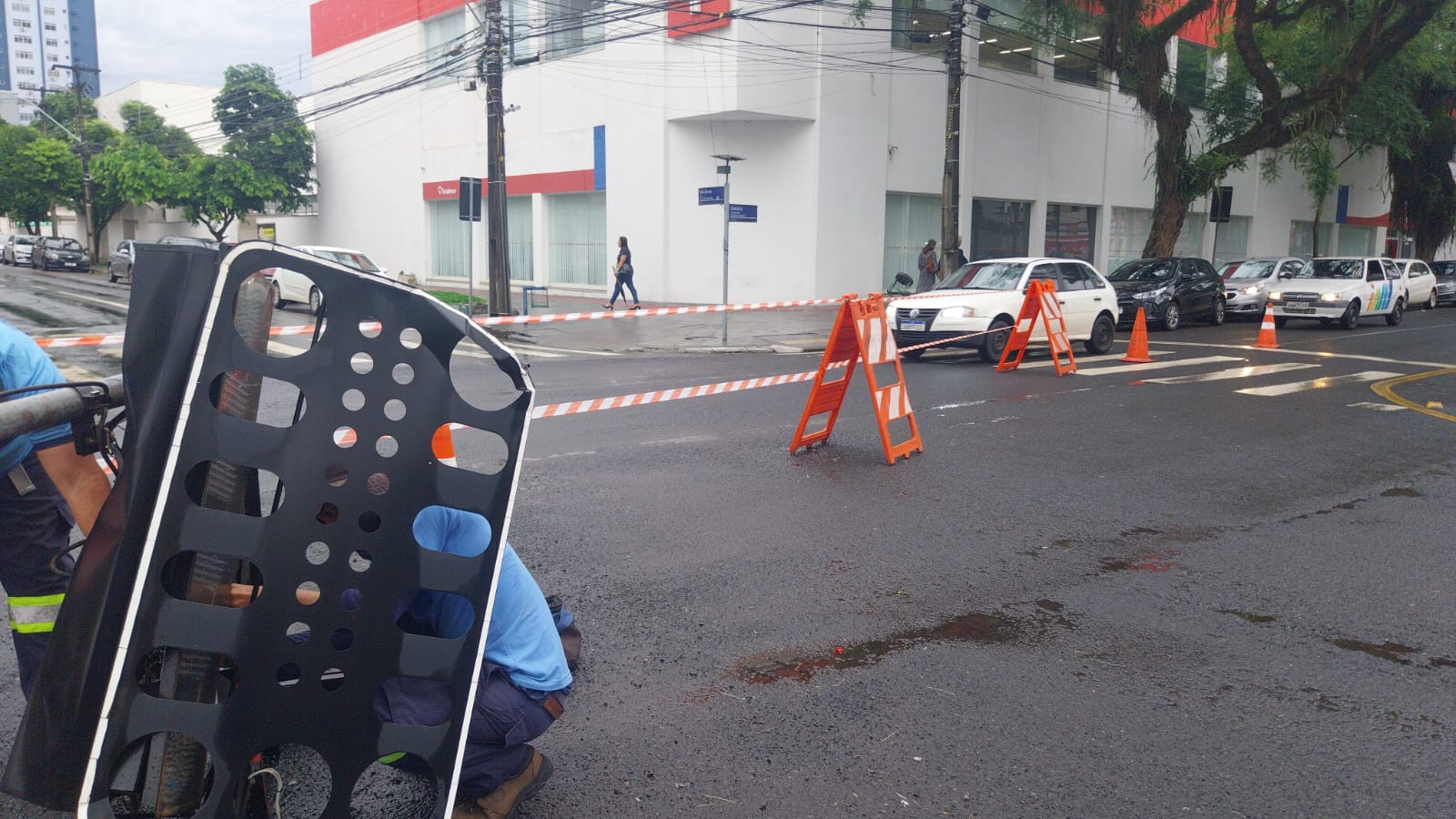 O reparo começou e os agentes de trânsito sinalizam o local.