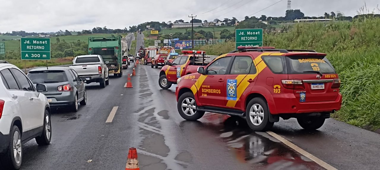 Durante um deslocamento para uma ocorrência, um caminhão do Corpo de Bombeiros de Maringá sofreu um acidente, após o veículo aquaplanar na pista. O veículo bateu contra um barranco.