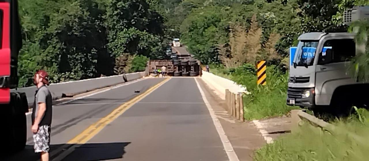 A carroceria de um caminhão graneleiro tombou bloqueando completamente as duas pistas e espalhando soja na rodovia.