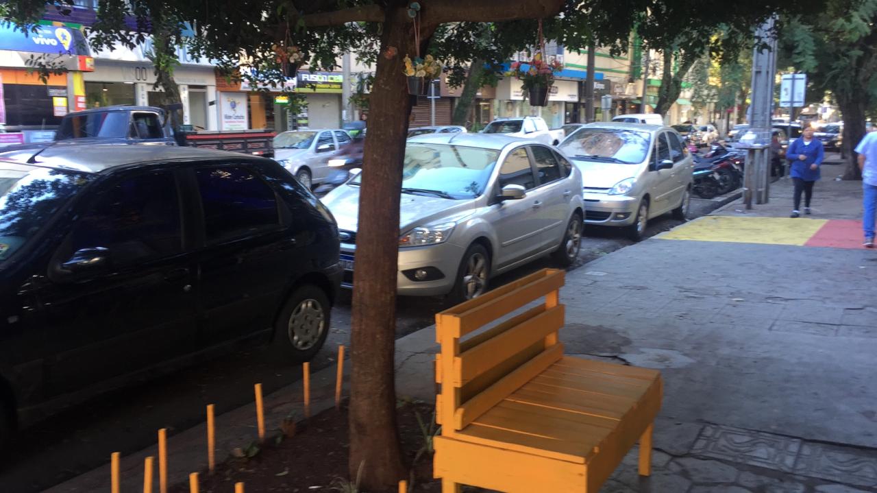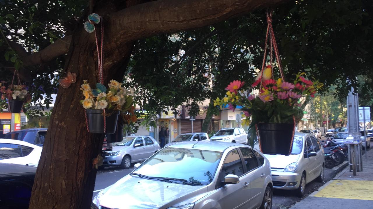 E quem está pelo centro, cansado de tanto bater perna, pode dar uma paradinha para descansar em frente à loja do Irineu Diotto. É outro exemplo de gentileza. O comerciante instalou um banco de madeira debaixo de uma árvore e em frente à loja. Tem sombra, e para tornar o espaço mais acolhedor, a árvore recebeu enfeites: passarinhos e vasinho de planta artificial. A ideia foi a da mulher do seu Irineu.