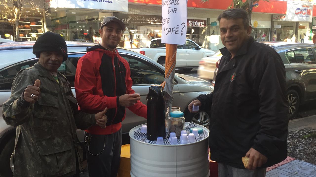 O Bruno Ramos, que também faz parte da equipe, diz que no começo eles estranharam o café na calçada, mas o cartaz que acompanha a gentileza encorajou o pessoal.