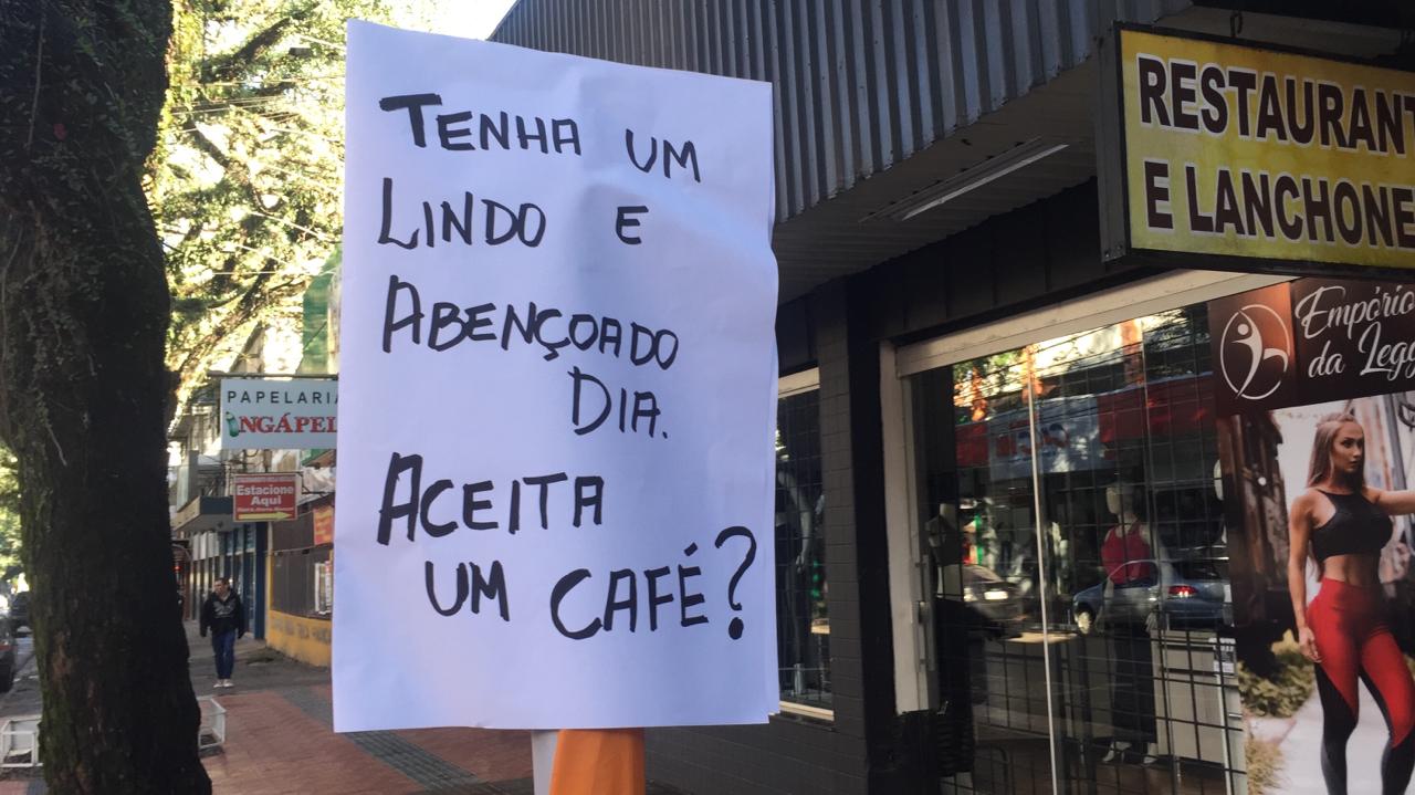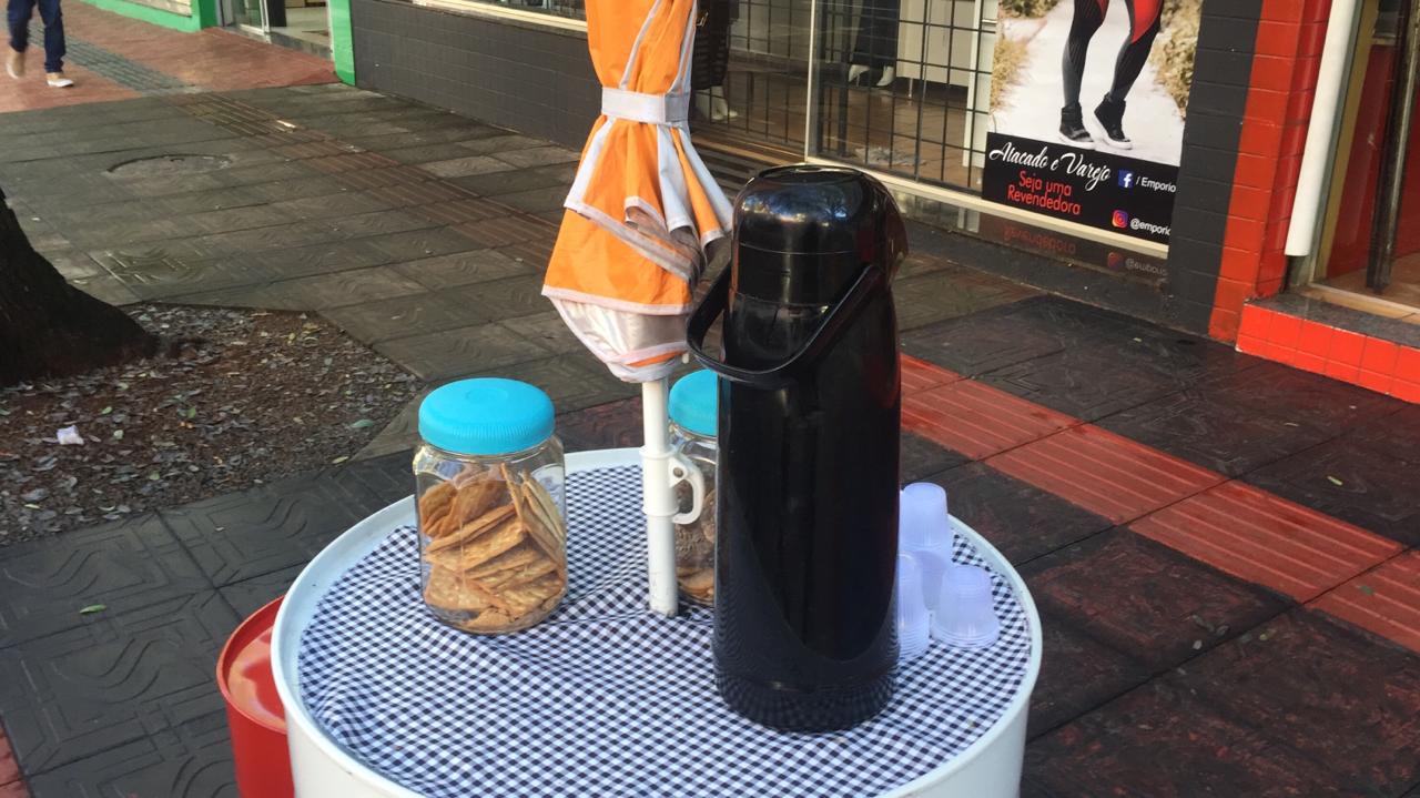 Cidade por Luciana Peña em 05/07/2019 - 10:16Um exemplo é a dona de um restaurante, no centro de Maringá, que oferece cafezinho e bolachas para quem passa pela calçada. No começo da manhã, ainda com o restaurante fechado, Elaine Oliveira coloca uma garrafa de café sobre uma mesa com potes de bolacha e bandeja de bolo. Fica na calçada para quem quiser pegar. É de graça. Tem gente que estranha, desconfia, mas acaba enchendo o copinho. Afinal, quem dispensa um cafezinho? A Elaine começou a oferecer o café na calçada há uns três meses.