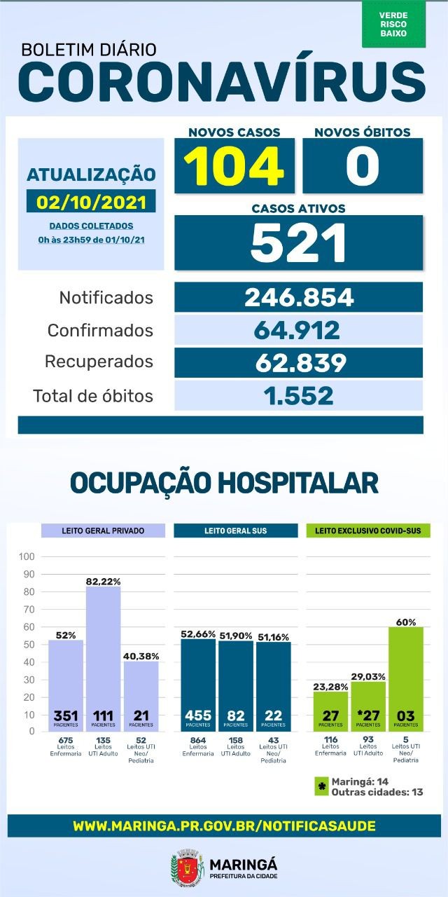 A Secretaria de Saúde de Maringá registrou 104 novos casos de coronavírus neste sábado (2) . O documento não registra morte por complicações da doença.