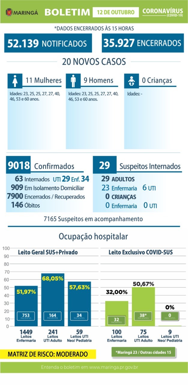 No boletim desta segunda-feira (12) a Secretaria de Saúde de Maringá informa que foram confirmados mais 20 casos de coronavírus e uma morte.