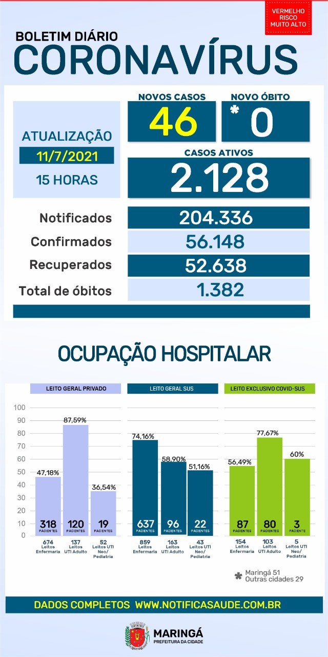 A Secretaria de Saúde de Maringá registrou 46 novos casos de coronavírus neste domingo (11). Nenhuma morte foi registrada.