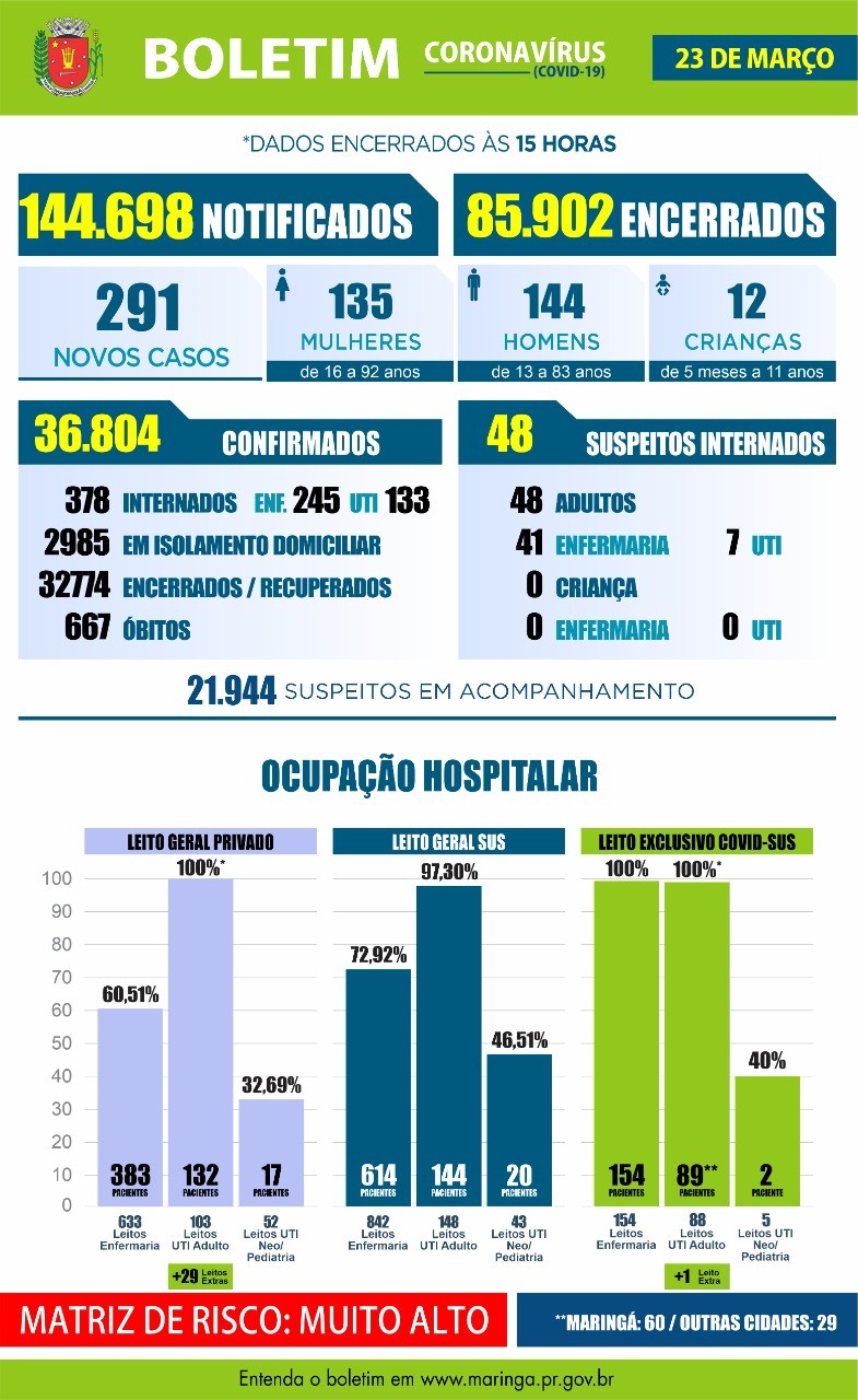 O boletim desta terça-feira (23), mostra que, dos 291 novos positivados, 144 são homens, 135 são mulheres e 12 são crianças. Maringá soma 36.804 casos positivos de coronavírus desde o início da pandemia. Desses, 32.774 já estão recuperados, 2.985 estão em isolamento domiciliar, 378 estão internados (133 em UTI e 245 em enfermaria) e 667 morreram por complicações da doença.