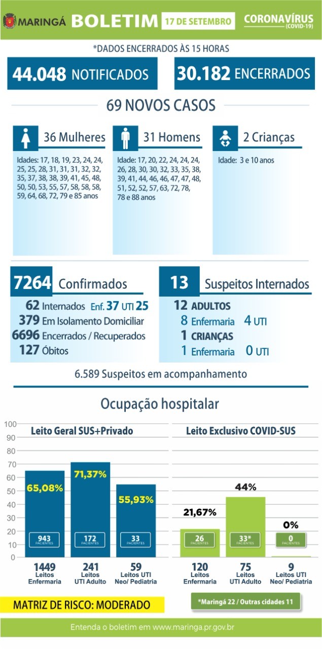 A taxa de ocupação hospitalar geral nos leitos de UTI Adulto de Maringá, incluindo SUS e unidades privadas de saúde, está em 71,37% nesta quinta-feira, 17. Na UTI neonatal/pediátrica, a taxa está em 55,93. Já a taxa de ocupação de UTI Adulto em leitos exclusivos para covid-19, pelo SUS, é de 44%. Nos leitos exclusivos para covid-19 da UTI neonatal/pediátrica não há crianças internadas.