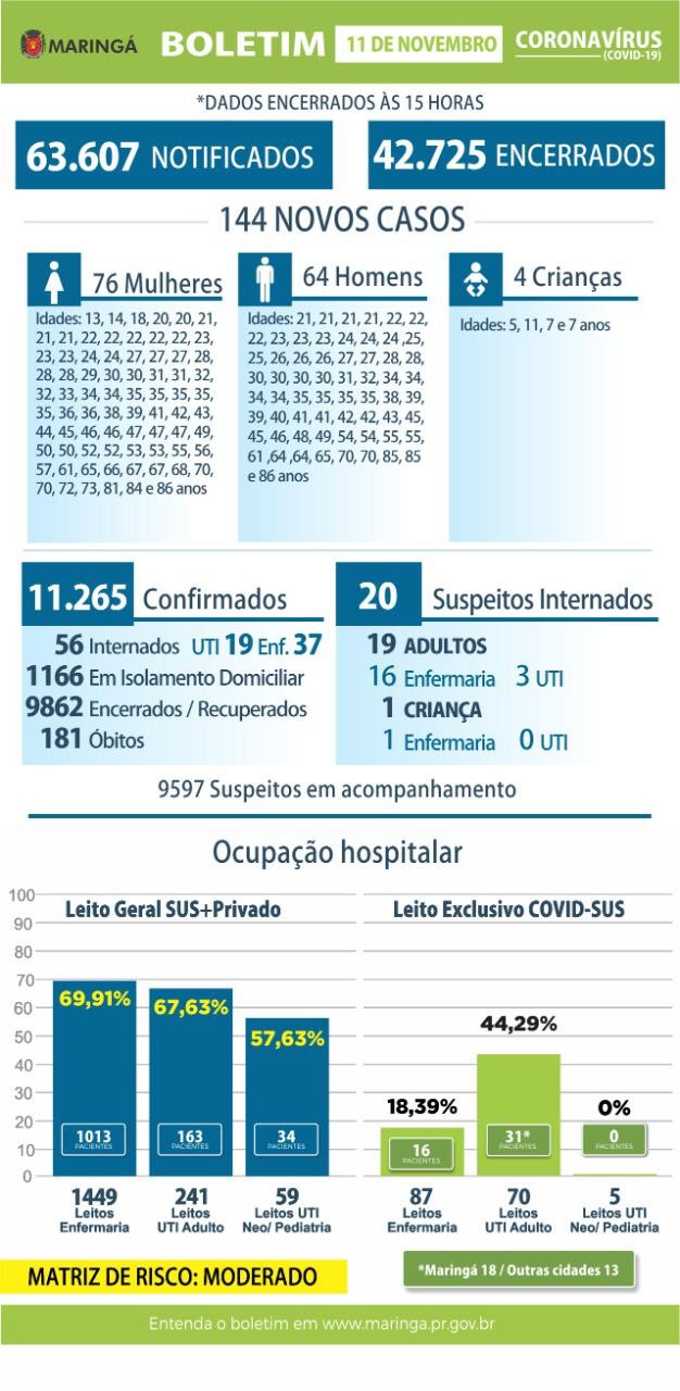 Atualizado às 15h desta quarta-feira (11), o boletim também indica 144 novos casos positivos de coronavírus em Maringá. As novas confirmações se referem a 64 homens, 76 mulheres e quatro crianças.