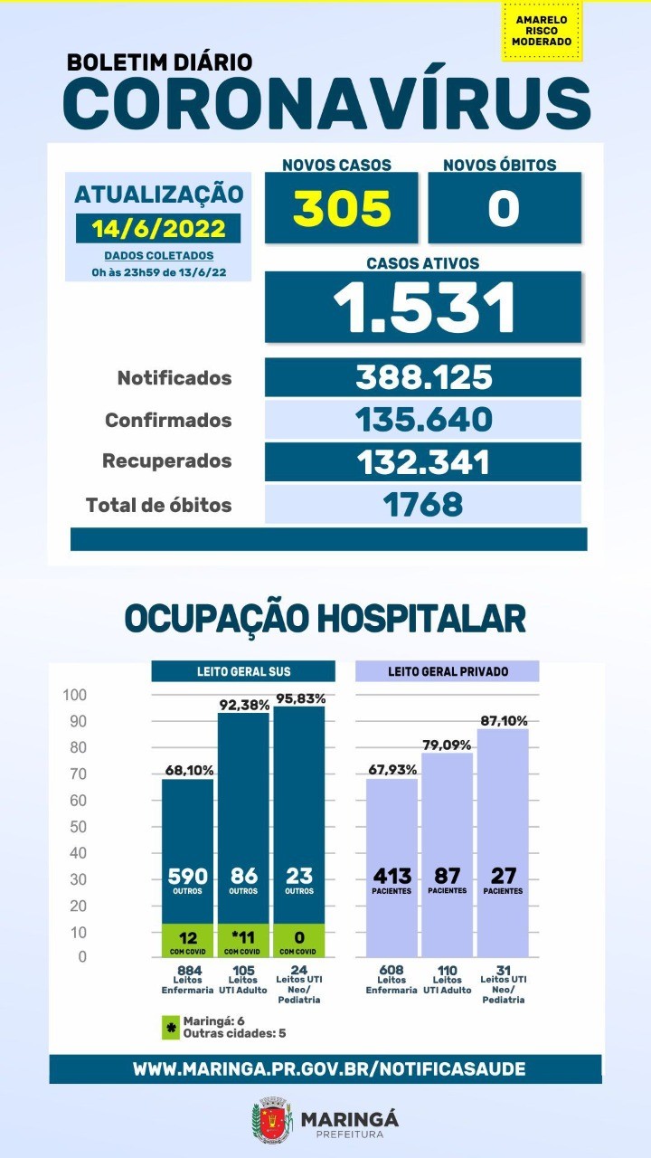 Maringá confirmou 305 novos casos positivos de Covid-19 no boletim desta terça-feira, 14 de junho. Não houve registro de óbito por complicações da doença.