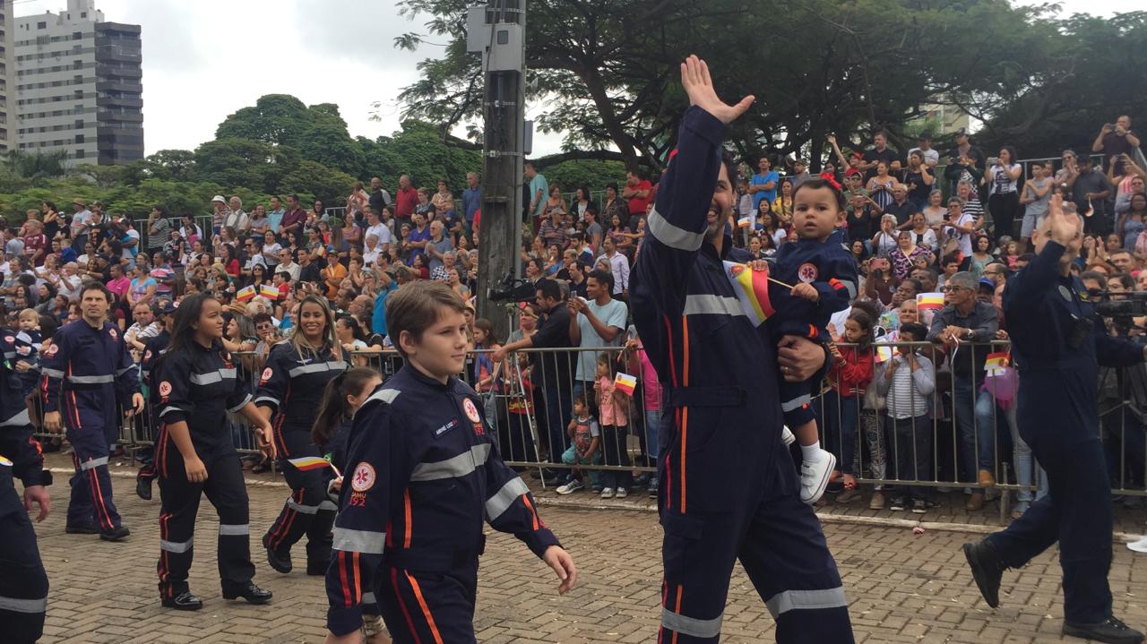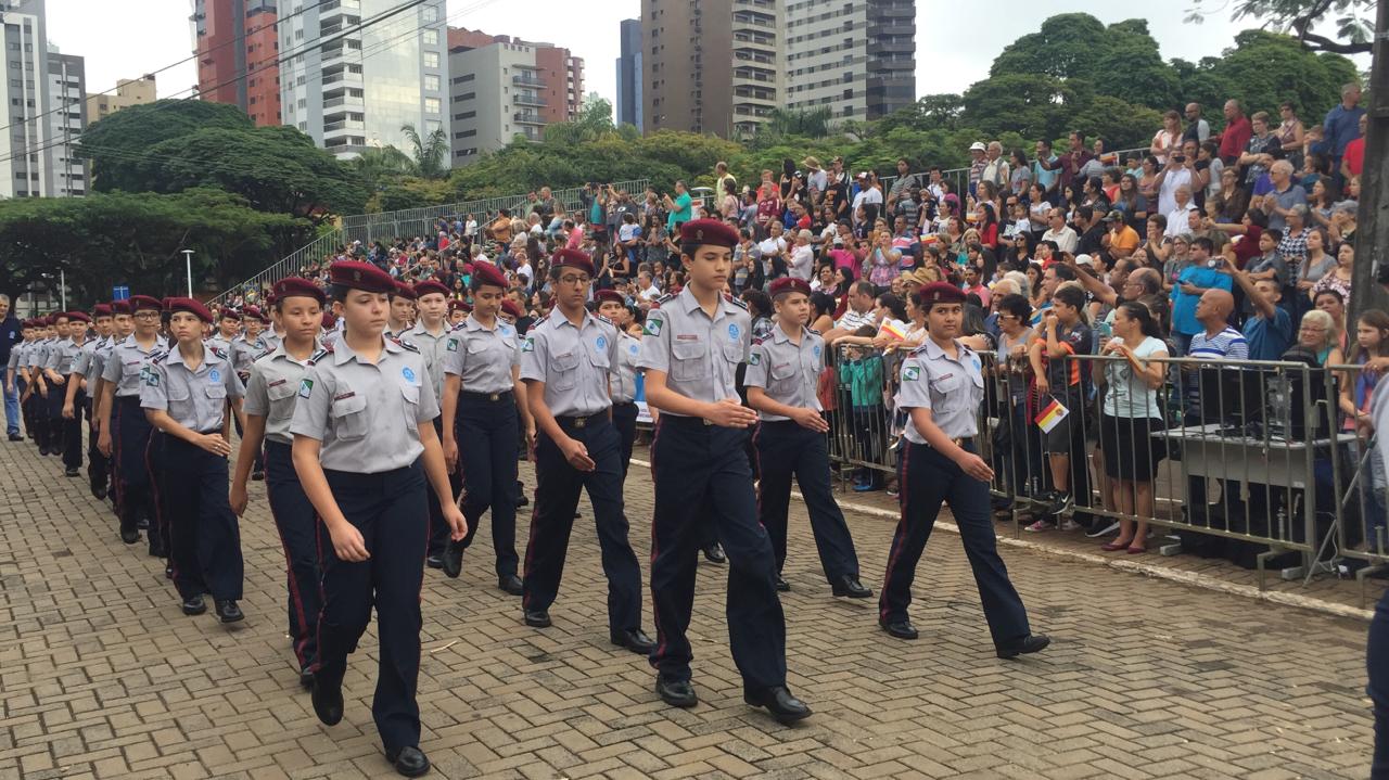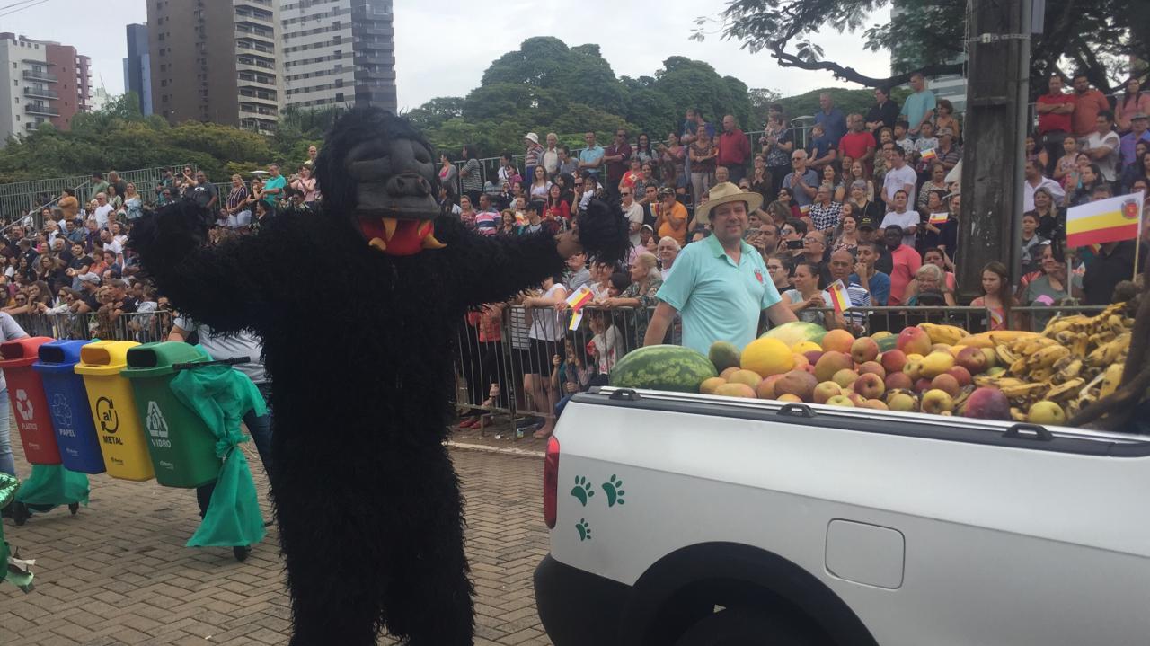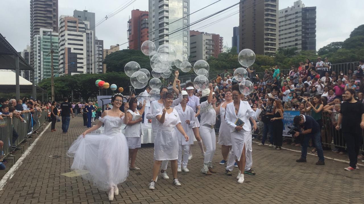 Da ala militar, uma mostra das forças de segurança. Na ala temática uma homenagem às mulheres. De todas as idades, elas tomaram conta da avenida. Das lavadeiras, fundamentais no início da colonização, e as professoras, que educaram gerações de maringaenses; às profissionais do futuro. O desfile também é educativo. O pessoal do Meio Ambiente levou para a avenida a mensagem de que é preciso ser responsável com a natureza e com os animais. Os pioneiros desfilaram em carros antigos. As crianças foram de bailarinas, esportistas... Raíssa Souza veio com o time de futsal feminino.