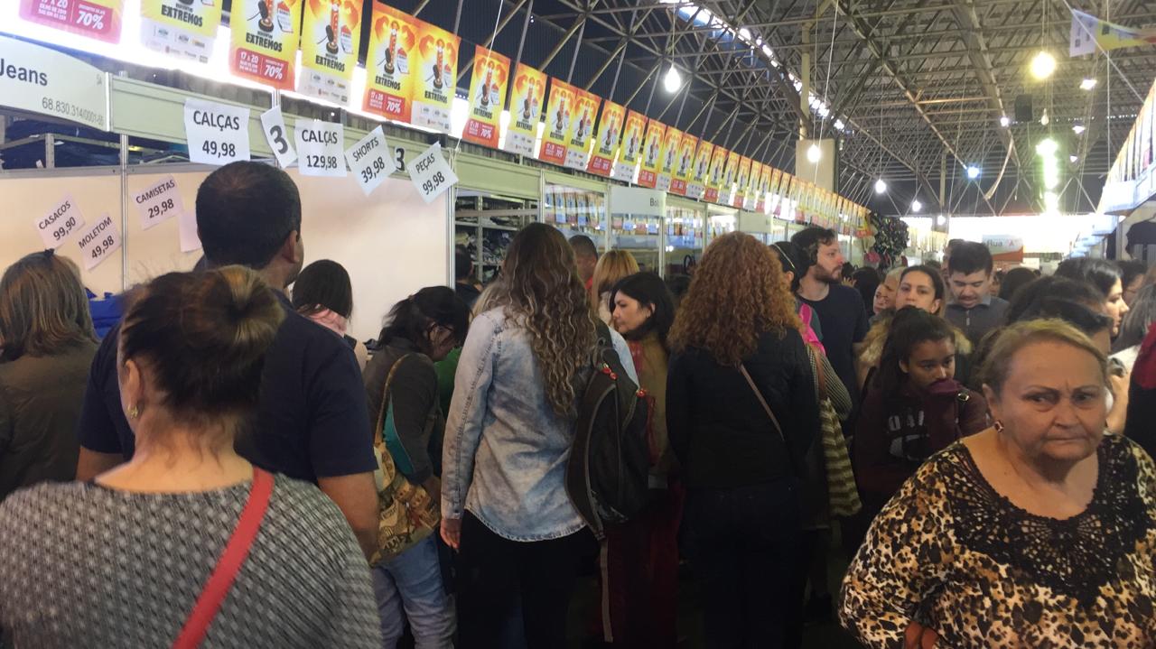 Feira Ponta de Estoque é sempre assim: consumidores se trombando pelos corredores, disputando espaço nas bancas. Mas ninguém se incomoda. O dia é para comprar mais barato e não importa nem se para isso precisa enfrentar fila. A Adriana Pereira ia encarar uma hora de fila para comprar calça jeans. E ela estava toda animada. A Adriana é consumidora cativa da marca, que todo ano está na Feira Ponta de Estoque de Maringá.