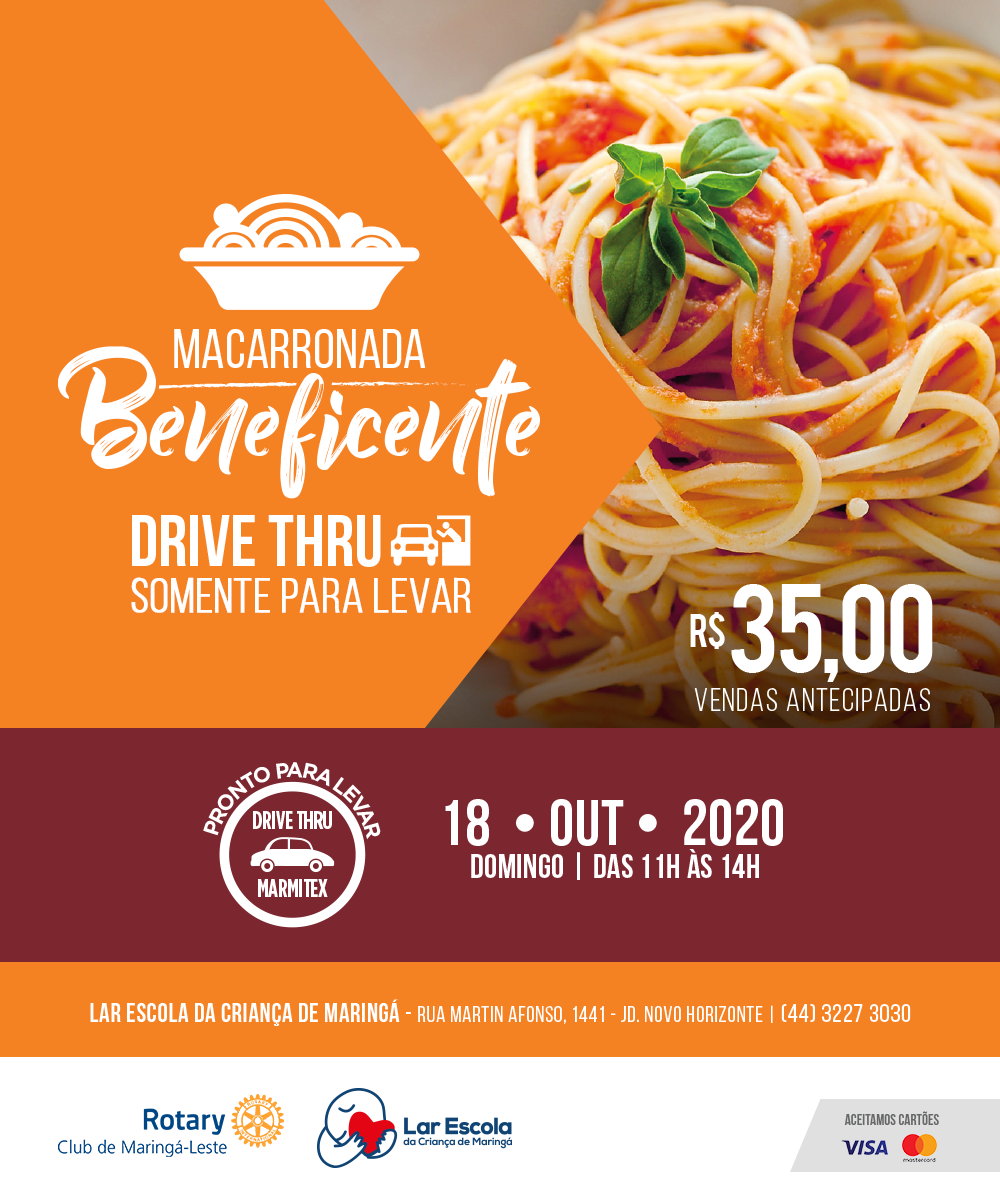 Cidade por Redação CBN Maringá em 13/10/2020 - 16:15O Lar Escola da Criança promove nesse domingo (18), uma macarronada beneficente com entrega no sistema drive-thru.