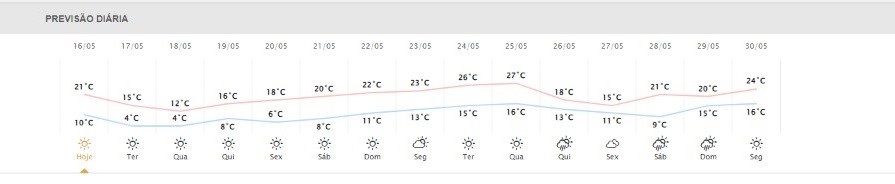 Mas é bom tirar as luvas e os cachecóis do armário. A previsão para essa terça-feira (17) é de mínima de 4ºC e máxima de 15ºC. Na quarta-feira (18), a previsão de mínima se repete. E o frio deve permanecer nos dias seguintes, com mínimas entre 8ºC e 6ºC.
