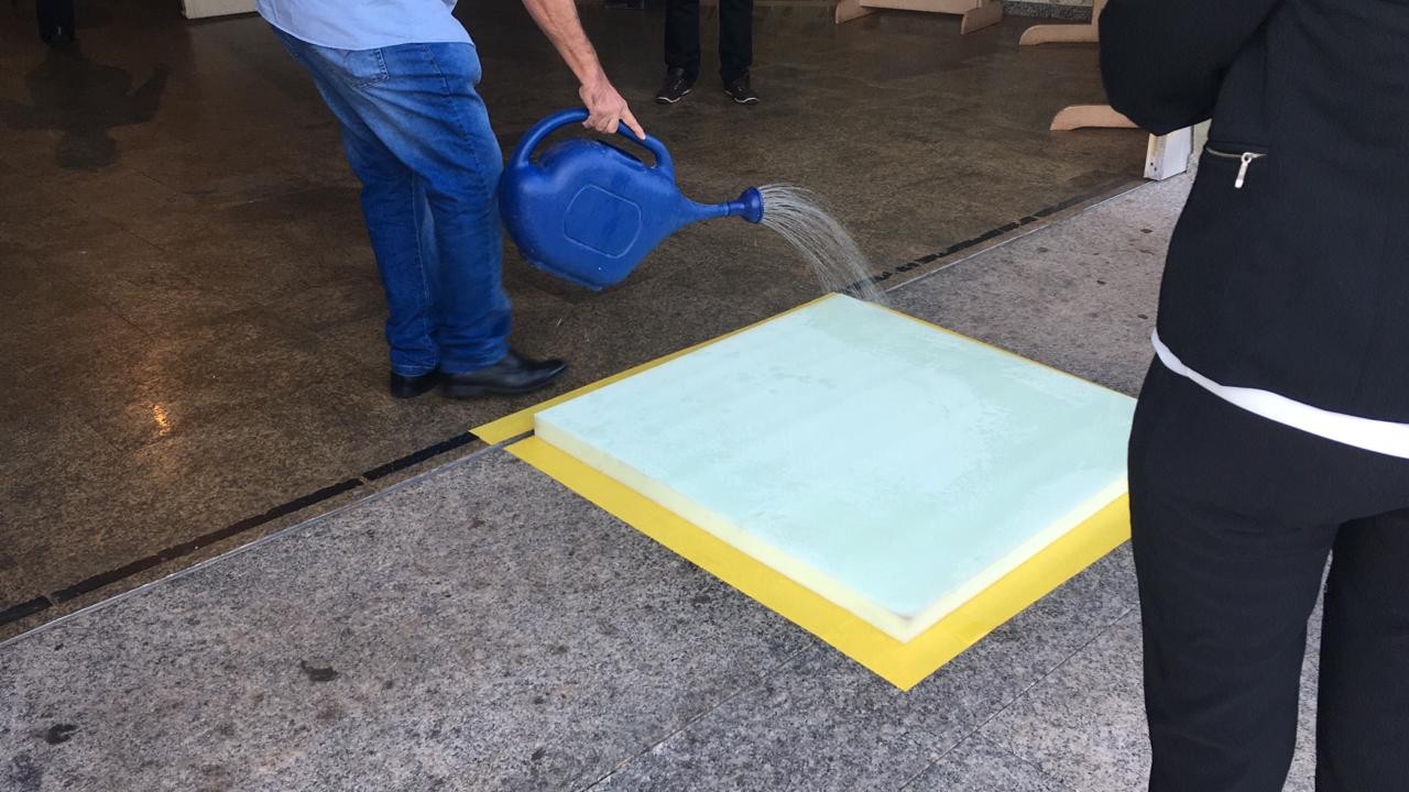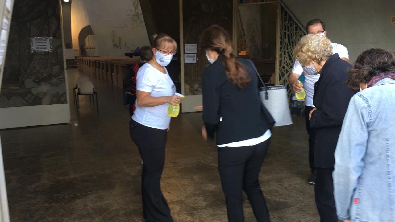 Lá dentro, um ambiente controlado. Na entrada, um tapete umedecido com água sanitária e álcool em gel aplicado nas mãos. No templo, bancos com marcação para indicar onde o fiel poderia sentar.