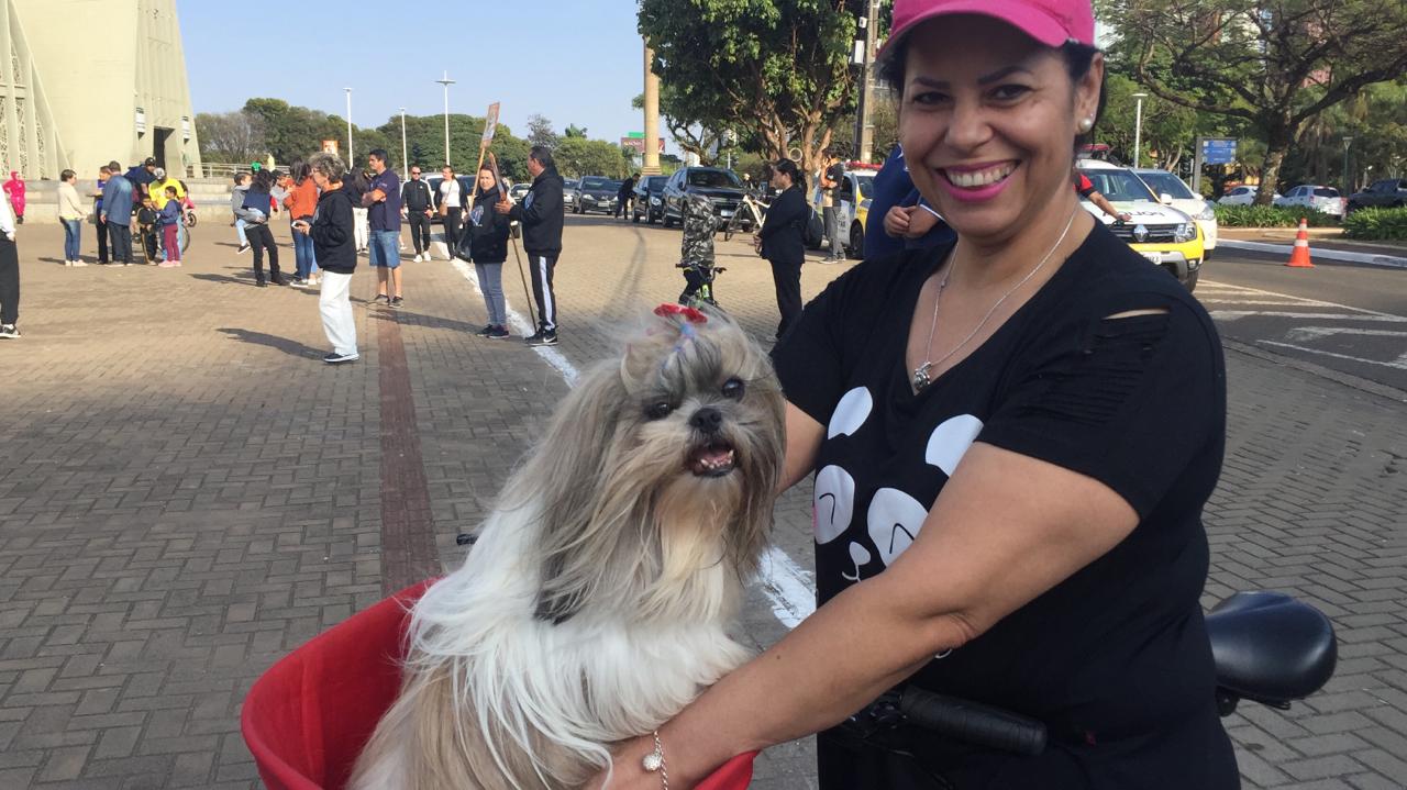 E se nas bikes tem espaço para os pequenos, tem também para os pets, que hoje são da família. E a Lucilene Almeida trouxe a Catarina.