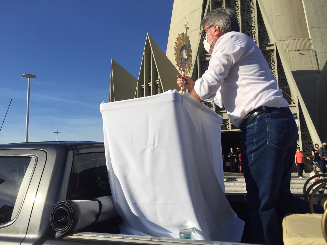 Sem tapete e sem procissão. Em vez da procissão, um “passeio” com o Santíssimo pelas ruas e avenidas do centro da cidade. Logo depois da missa, saiu o cortejo só com carros e a imagem do Santíssimo.