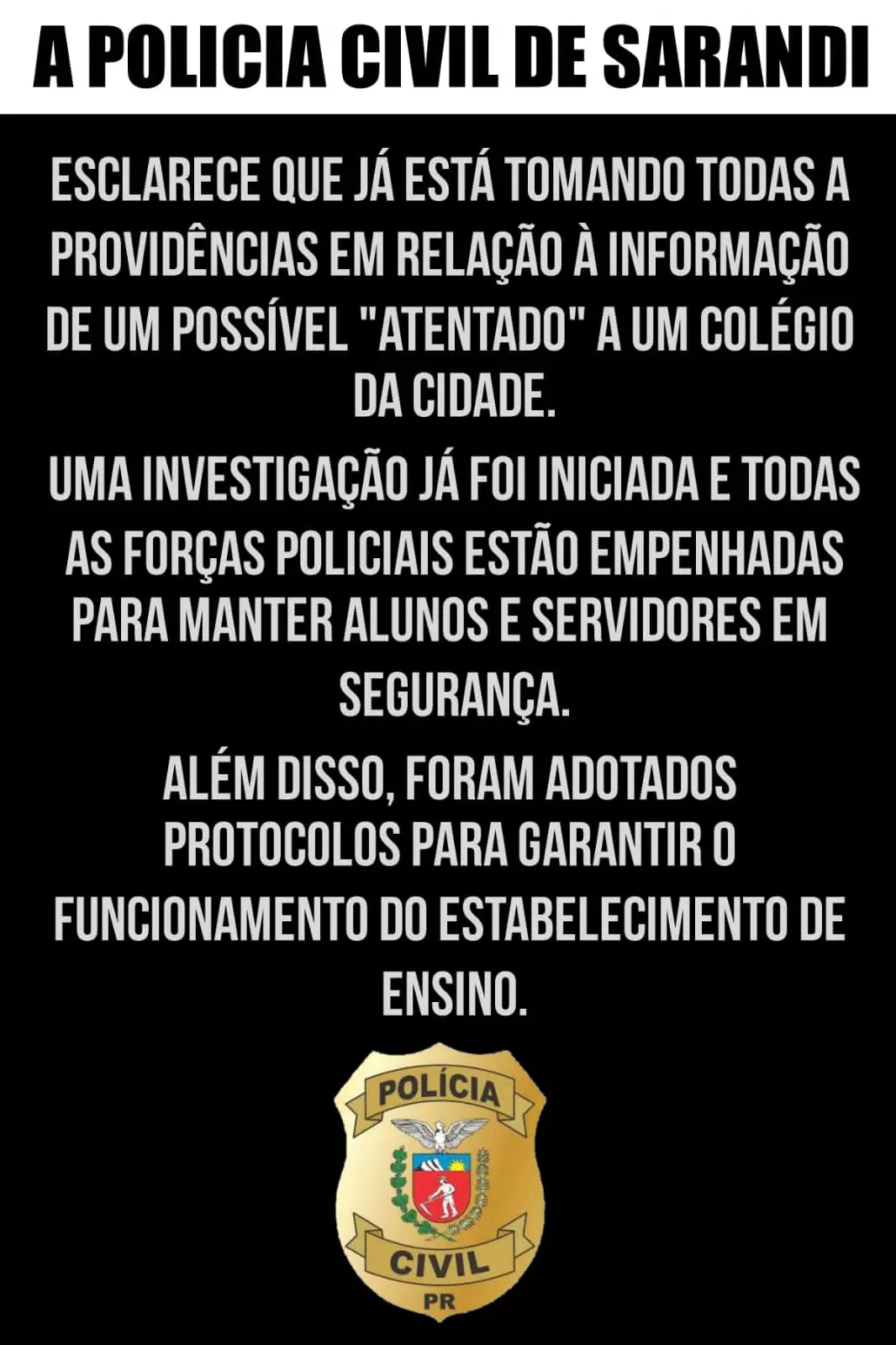 Segundo a polícia, as investigações foram iniciadas em um empenho para manter alunos e servidores em segurança. A mensagem divulgada por meio de uma rede social, informa ainda que foram adotados protocolos para garantir o funcionamento do estabelecimento.