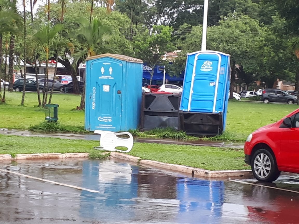 Com o vento forte, a estrutura de uma decoração natalina disposta na praça da Catedral foi danificada. Um banheiro químico que também está na praça por conta do projeto Maringá Encantada chegou a tombar.
